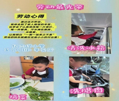 春假期间,一年级的孩子从最基础的整理书桌、浇灌绿植做起,在细微之处养成良好的生活习惯;二年级的学生开始走进厨房,择菜、洗菜、学习垃圾分类,在参与中体会家庭责任;三四年级的学生则进一步挑战自我,淘米煮饭、制作凉拌菜、种植盆栽,在实践中掌握生活技能;而五六年级的学生更是化身“家庭小帮手”,不仅能翻炒时蔬、自制青团,还主动承担起全屋大扫除的任务,用实际行动为家庭贡献力量。